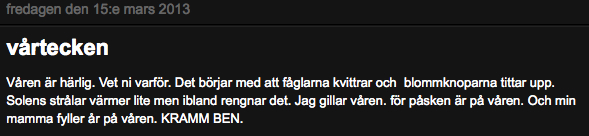 Vad gäller gossens bloggande är det ganska roligt att iaktta hur han hantera det hela. För det första är det hans egen idé att blogga, han fick tjata en vecka eller två innan vi tog oss tid att tillsammans starta den. När den väl var igång frågade jag vad hans tankar är men bloggen. Den är i första hand till för nära och kära, och han har som uttalat mål att skriva ett par två-tre gånger per vecka. Och det gör han nästan, oftast på alldeles eget bevåg. Detta blogginlägg visste jag inte ens om att han filade på, utan det trillade in i min Reader.
