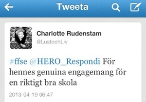 #ffse betyder ”follow friday”, och är ett sätt att tipsa andra twittrare om bra Twitter-konton att följa. Tillägget ”se” står får Sverige. Robert Klåvus berikar själv mitt flöde, och innan han skrev #ffse till mig hann jag följa flera andra av de han #ffse:ade. Så jag blev lite extra glad att få denna underbara uppskattning! Tackade gjorde jag också, med att ge en #ffse tillbaka: