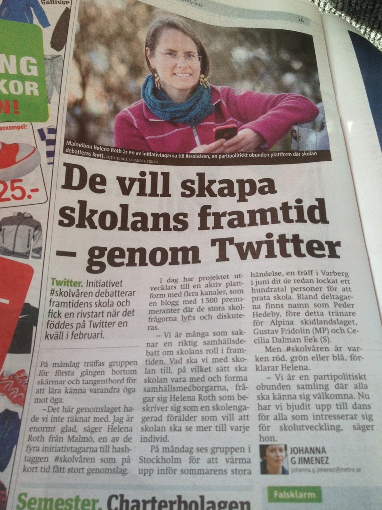 Fick veta av Johanna som skrev artikeln att Metro publicerat den i alla tre versioner av Metro, så det har strömmat in nya följare på #skolvåren på Twitter och de sista platserna till sommarens stora händelse, #skolvårens afk i Varberg 18-19 juni är tagna! Även på Facebook har artikeln rönt uppmärksamhet, och jag har fått många glada tillrop även där.