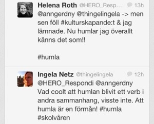 20130427-100312.jpgJag gläds åt att verbet humla nu sprids, för det är ett härligt koncept tycker jag. Det var på Graniten Engineering som jag, under en tänkolog-utbildning, myntade begreppet och vi spånade vilt på betydelsen. Vi arbetade med kulturskapande, vilket var oerhört inspirerande. Vi landade ungefär i detta: