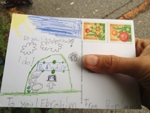 Dolt i högarna som hamnade i mangelkorgen fann jag två för-adresserade vykort till barnens fadderbarn via Barnfonden. La fram dem och minstingen nappade, ritade en tjusig teckning och skrev en kort hälsning på engelska till sitt fadderbarn, en pojke i Etiopien.