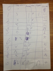 De där krumelurerna var siffrorna 100 – 10 – 1 med egyptiska tecken. Sonen fortsatte med babylonska siffror, kinesiska, romerska osv. Vi fastnade på de romerska, för varken sonen eller hans föräldrar kom ihåg vilken av D C L som betydde vad (500 – 100 – 50, har jag lärt mig nu). Så maken googlade och landade på en sida på Wikipedia med en jämförelsetabell. Nytt papper fram och sonen kastade sig över det för att skriva av tabellen: