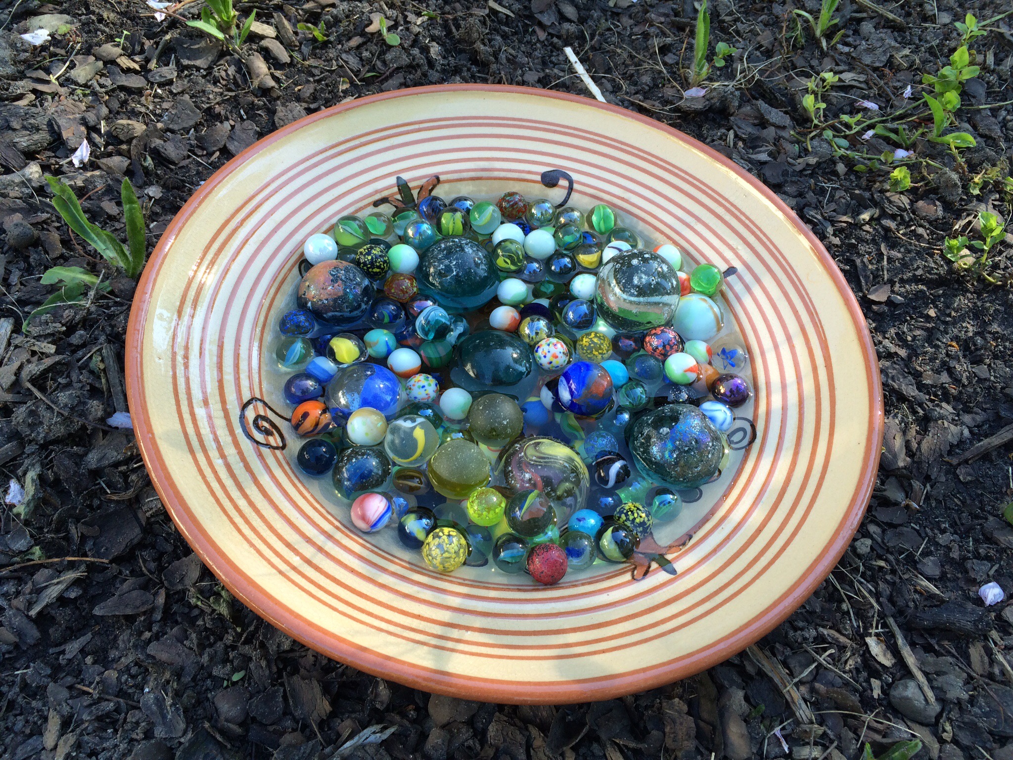 Jag läste det där och blev överlycklig, eftersom jag har en stor skål med sonens spelkulor i pannrummet i källaren. Han ville inte skänka bort dem, men använder dem inte längre. Men nu kom ett par handfull spelkulor till användning, och fatet som maken hittade ställd vid sidan av en av containrarna på vår lilla återvinningsstation (där det givetvis inte borde stått, eftersom det inte är en förpackning) var alldeles lagom grunt.