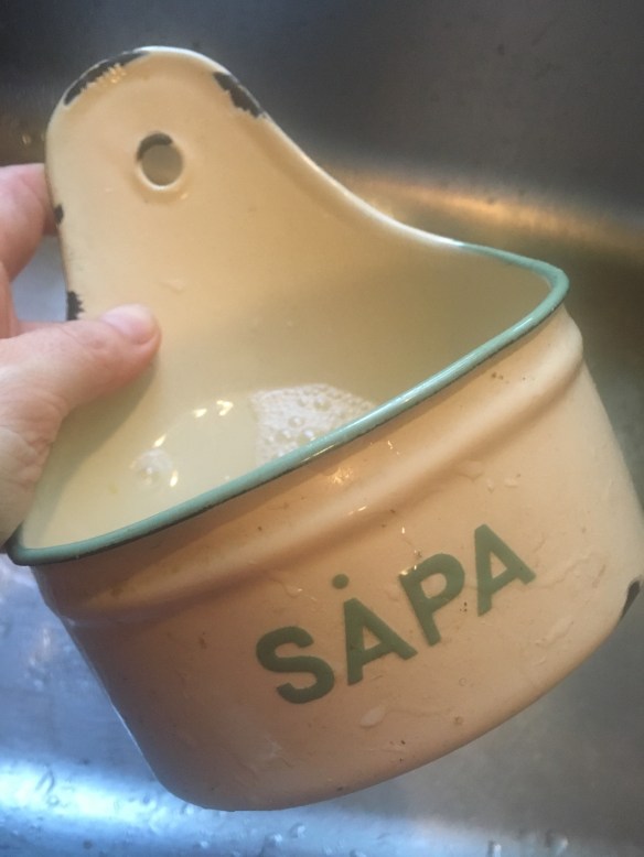 Mitt vackra emaljerade såpa-kärl från Kockums som används dagligen i köket (har utspädd diskmedelslösning i det, och duttar diskborsten i kärlet när jag ska handdiska något) har gått sönder!