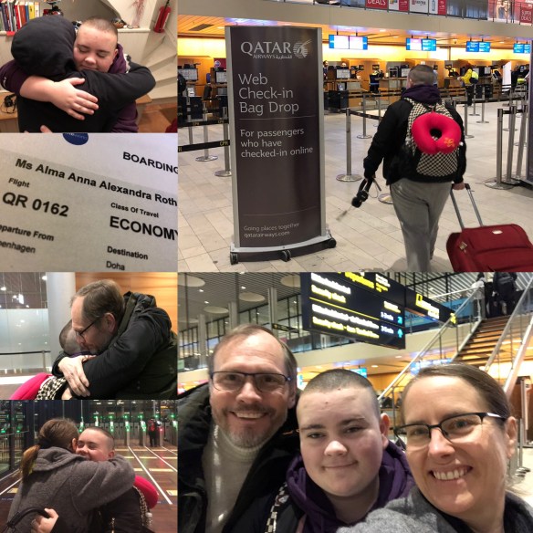 Innerliga kramar, både från mig, pappa och lillebror, när det var dags att säga på återseende till 19-åringen som i detta nu sitter på ett flygplan med destination Doha, vilket är mellanlandningen innan nästa del-resa som slutar i Sydney, Australien.