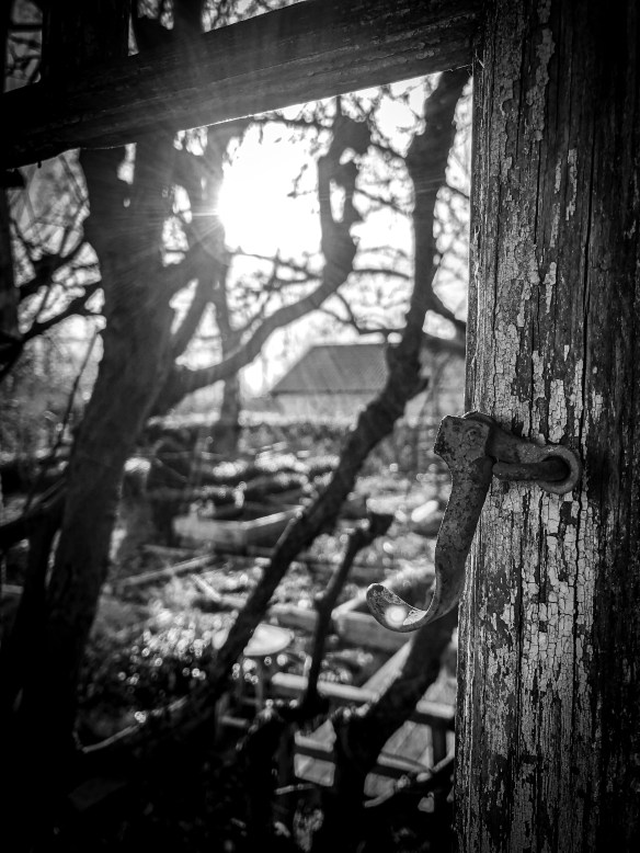 Tog ett par drag i döda hallongrenar, tänkte Nej, jag ger upp, men drog i några fler, och några fler. Fast så mycket mer än en tjugondel av allt rörde jag inte. Det finns kvar till en annan dag.Fotograferade den gamla fönsterkarmen som hänger i lindbersån som ett fönster till trädgården bortom bersån. Busade med katten Pop som satt på trädgårdsbordet och njöt av solskenet.