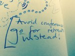 So. I’ve progressed. Full-day traditional conferences no longer do the trick for me, I have different preferences. Now I just need to remember this, the next time an opportunity pops up. And a few already have popped up I just realized. Hm. Time to act according to my understanding, and drop the ”Well just this one time”-attitude that is so easy to fall into when changes are to be made. What’s your best trick for following your wisdom rather than your old habits, in a situation like this?