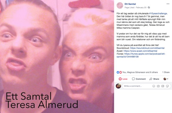 Lyssnar till Caspian i Ett Samtal med sin mamma, Teresa Almerud. Eftersom Caspian är en av mina lekkompisar (jodå, det kan man absolut ha som 40+:are, rekommenderas varmt!) och jag hittills inte lyckats träffa ”mamma Caspian”, tillika Teresa, men sett hennes kommentarer på Facebook på diverse inlägg Caspian lägger ut, så var jag mycket nyfiken på detta samtalet. Och det gjorde mig definitivt inte besviken, tvärtom!