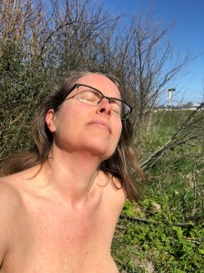 Upp igen… och istället för att svepa handduken om mig drar jag med handduk, kläder och cykel runt buskagen. Hittar lä. Brer ut handduken på marken och sätter mig ner. Blir sittande en stund, med en känsla av att det likväl kunde varit en varm sommardag.