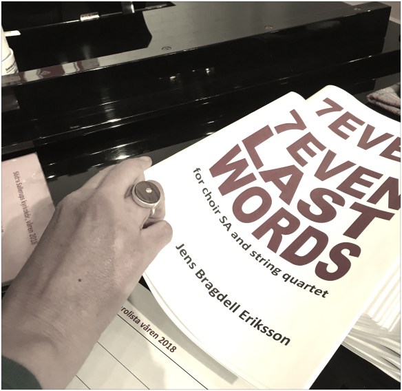 Och det är än mer speciellt för mig då Jens skrev stycket åt Södra Sallerups kyrkokör, och även skrev det med oss. Han kom med en bibba uppkopierade noter en av de första körövningarna på vintern 2016, och när vi började ta oss genom takt efter takt så hummade han emellanåt, rynkade pannan, spelade variationer på pianot innan han fattade pennan och plitade ner något i noterna allt medan vi satt där medan han ”bestämde om sig”. Nästa körövning kom han så med en ny bibba uppkopierade uppdaterade noter, och så höll det på ända tills vi fick det faktiskt häftet i vår hand, med alla sju satserna, färdiga.