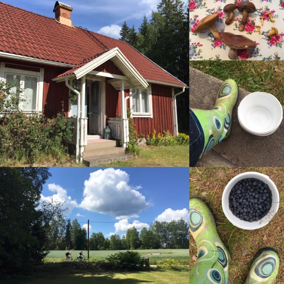 Bad och grillning, skogspromenader och loppis i Holken för di vuxne medan gossarna cyklar till fotbollsplanen i Eringsboda, älgbeskådning och kopparormsdito. Solsken och regn, rop efter katten Sally som tog tillfället i akt när det kom besökare att verkligen bli en skogskatt, gossarna kastar amerikansk fotboll och tumlar runt på stora gräsmattan. Huppegupptäcksfärd i alla spännande uthus av olika slag, gamla utedass och kallvindar, slipsten och gamla rostiga, ack så charmiga, verktyg som jag önskar kunde berätta om allt de varit med om under åren i torpet. Får mig till dels torpets historia, vem som bott där och när, över hundra år gammalt och bara inne på femte ägarna – imponerande må jag säga!