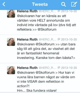 20131107-213551.jpg20131107-213557.jpg20131107-213603.jpgAtt skapa denna vana att reflektera, från ung ålder, det vore en ofantlig vinst – för oss alla. Vi skulle se ett ökat välbefinnande, en ökad livskvalitet och mental hälsa. Men, vi vet alla att barn gör som vi gör och inte som vi säger. Hur kan vi lära barnen detta om vi inte aktivt själva utövar reflektion, såväl hemma som i skolan?